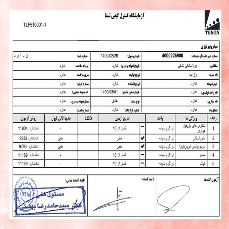 ✅دارای تست آزمایشگاهی غیر حیوانی🔬(میزان باکتری ها,مخمر و کپک) برای اطمینان از ایمنی بیشتر محصول